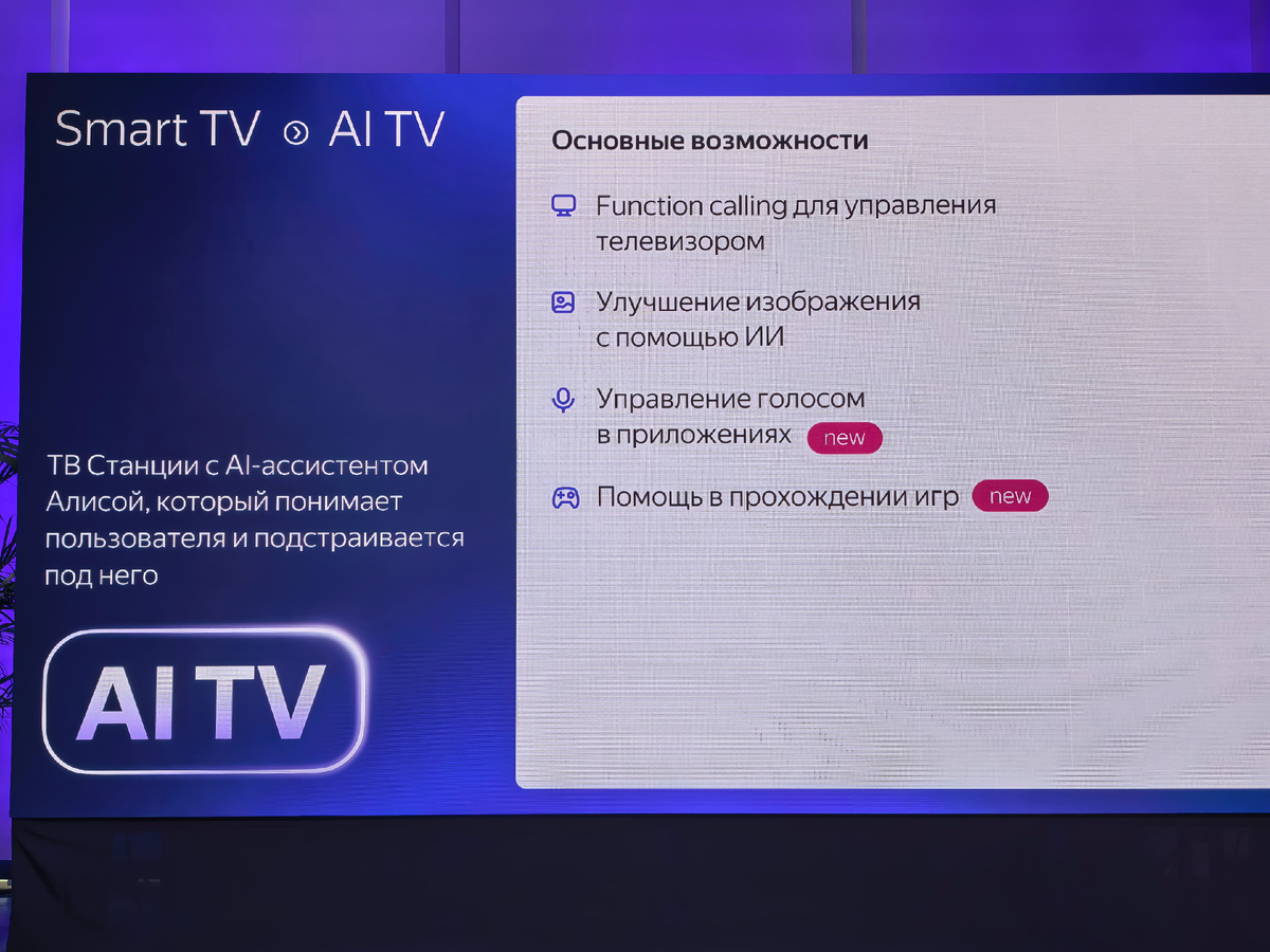 Высокая производительность позволяет реализовать продвинутые ИИ-функции «Алисы». Например, её можно попросить включить вчерашний сериал, не помня его названия, или автоматически выключить телевизор, когда кончится кино. Управление голосом работает и во внешних приложениях – Алиса «видит» пункты меню на экране и позволяет выбирать их голосовыми командами.