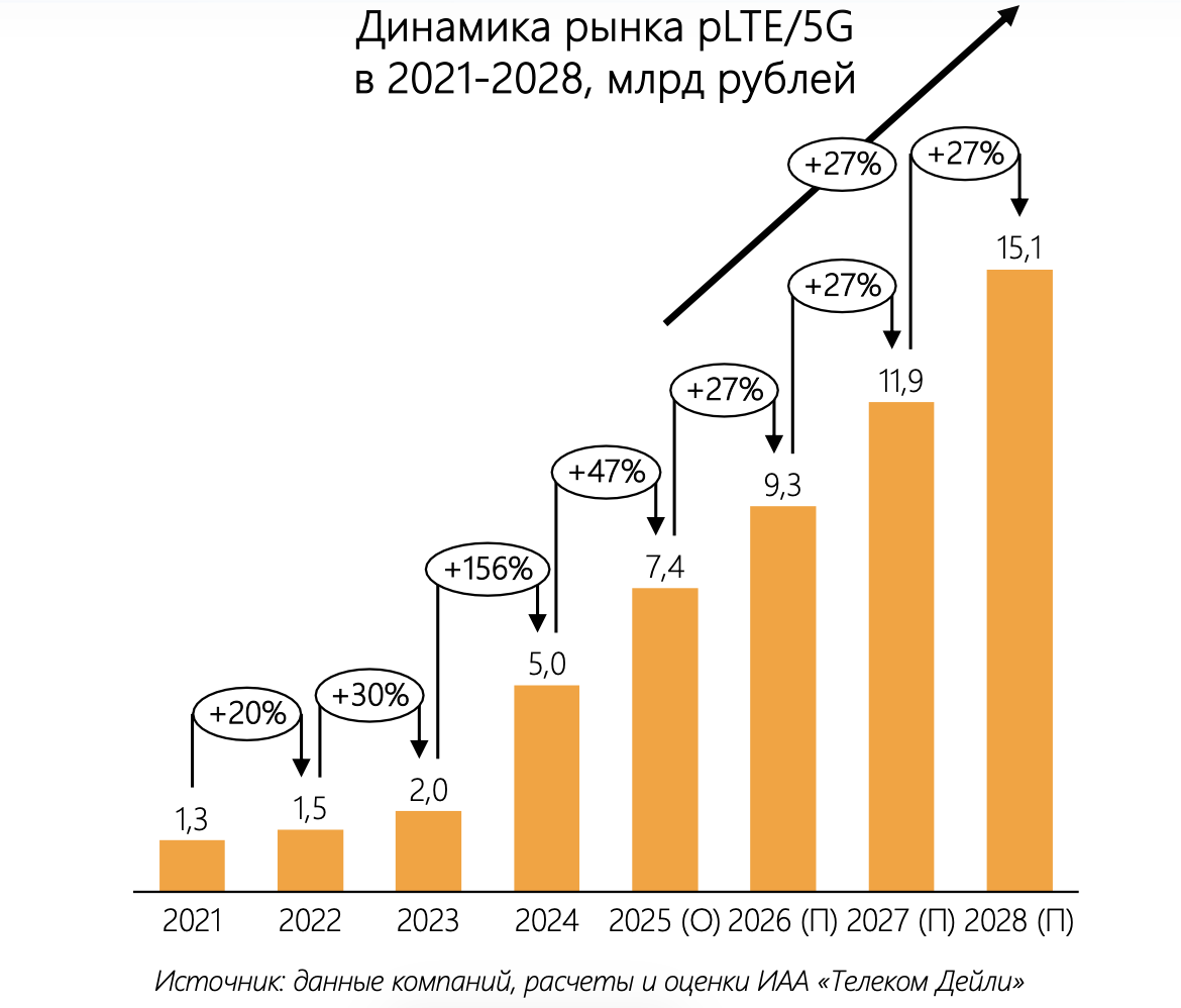 Прогнозируется, что рынок pLTE/5G в России будет расти в среднем на 25–30% в год — с переходом от частичных внедрений к серийным проектам.