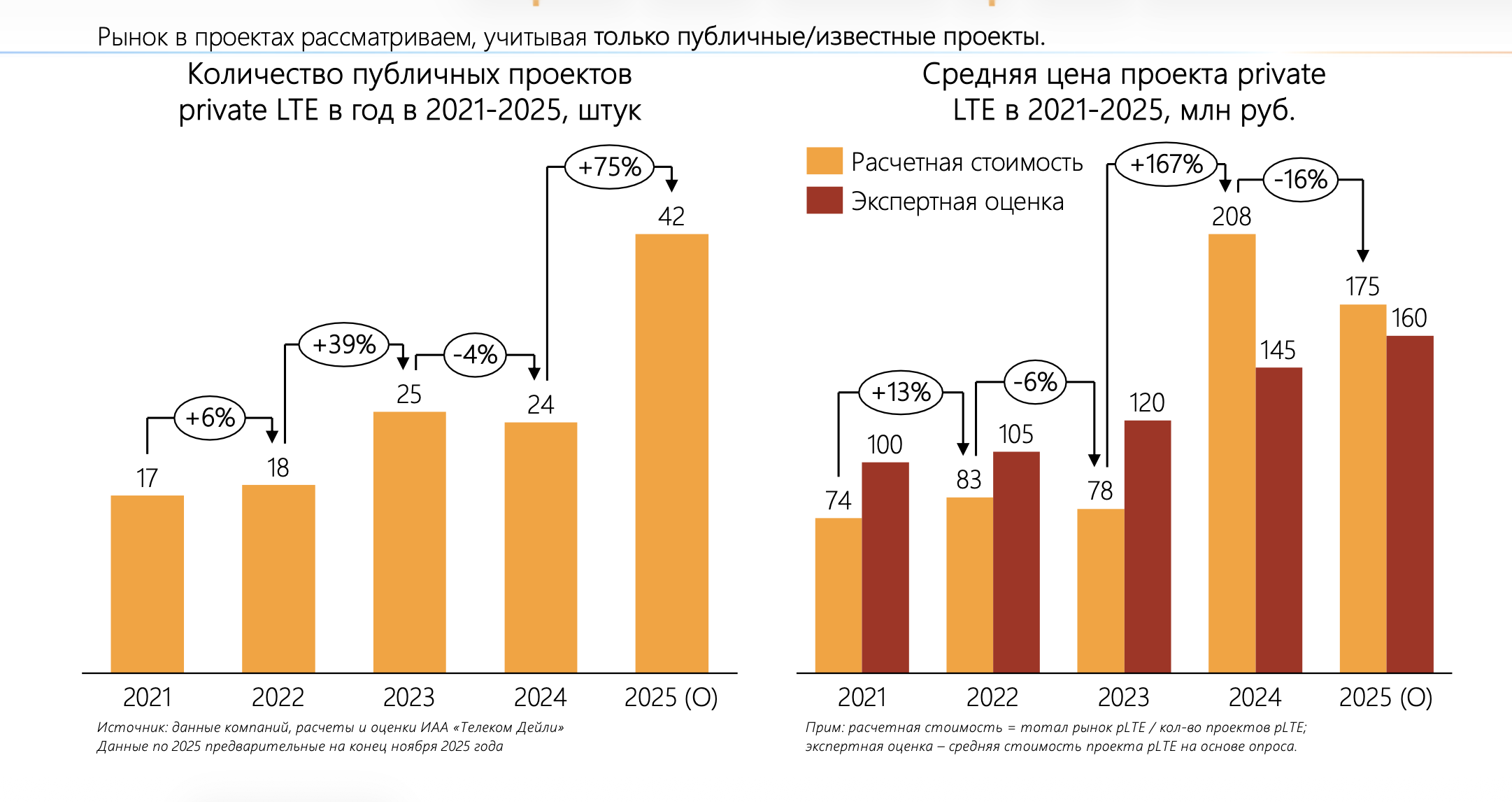 Если рассматривать только публичные проекты pLTE, то здесь резкого скачка в 2024 не произошло. Наоборот, их число сократилось с 25 в 2023 году до 24. В то же время их стоимость за этот же период значительно выросла — расчетная стоимость на 167% (в экспертной оценке — на 21%). Соответственно, отсюда последовал кратный рост в денежном выражении по итогам года.