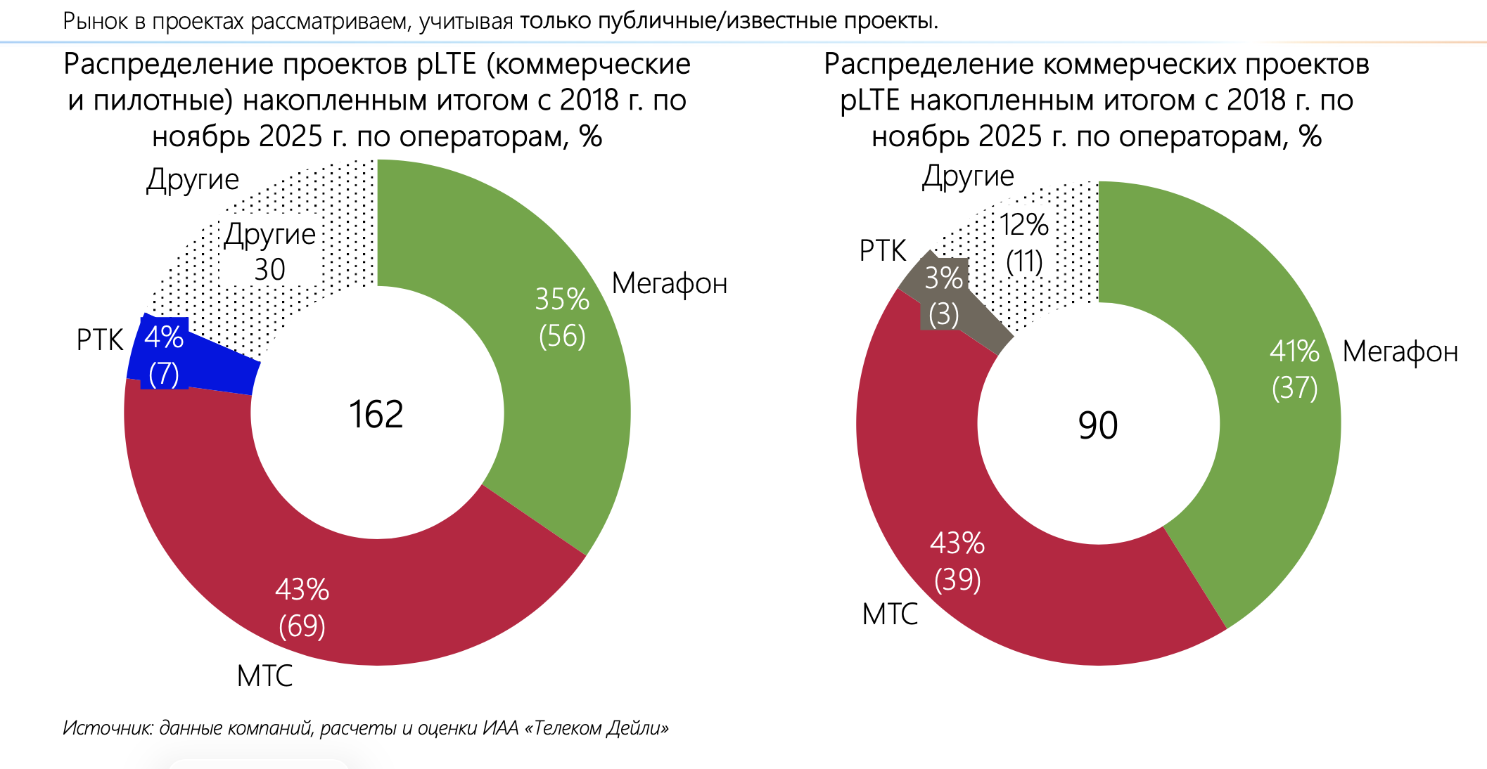 Всего в сегменте pLTE с 2018 по 2025 годы запущено 162 коммерческих и пилотных проекта (90 коммерческих и 72 пилотных), данные о которых открыты. 69 из них осуществил МТС (43%), еще 56 — «МегаФон» (35%) и 7 — «Ростелеком» (4%). При этом другие компании реализовали в совокупности еще 30 проектов (18%).