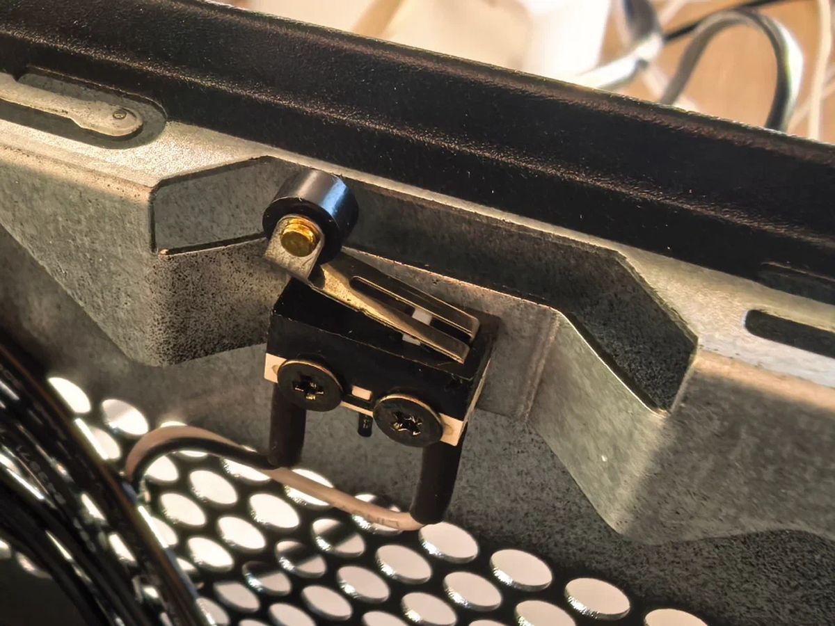 Собственно, мы уже переходим к более подробному изучению «начинки», давайте посмотрим, что внутри. Боковая крышка крепится на двух винтах и имеет удобную выемку для быстрого снятия. Как только вы её снимаете, срабатывает концевой выключатель, подключенный к материнской плате. Это детектор несанкционированного доступа к внутренностям ПК (так называемый Chassis Intrusion).